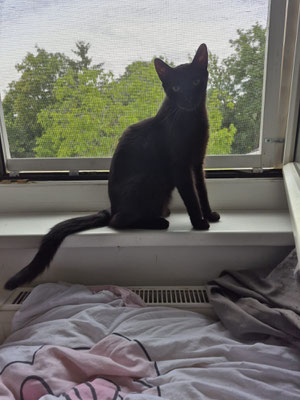 Pebbels (getigert, weiblich), Manitu (männlich, komplett schwarz) und Hödelline (weiblich, schwarz mit weißen Brust Fleck)